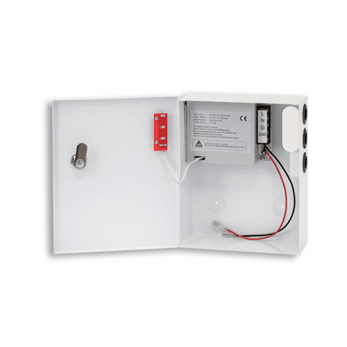 Power supply unit in box, 3A 12V with space for battery for video surveillance, alarm, and access control systems.